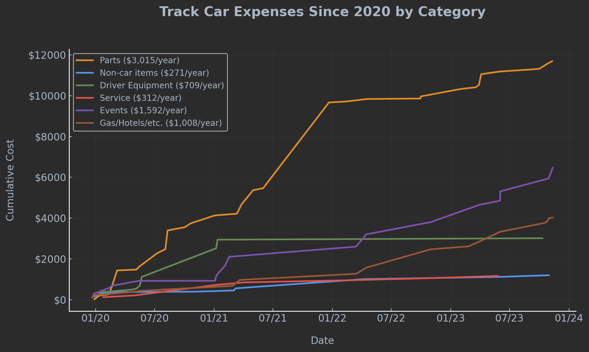 All other costs – service, random items to make the experience slightly better, driver safety equipment – were quite minimal compared to the running cost of the car and the cost to attend the events.