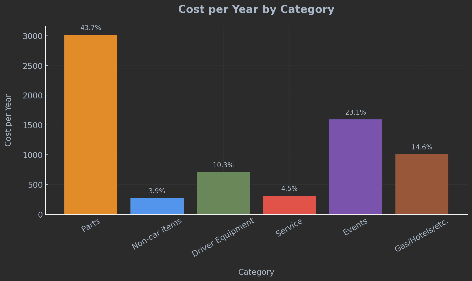 The next highest category at only 12% is gas, food, and hotels. It's worth mentioning again: the running cost of the car is only part of the expense of the track! If you drive way out to somewhere with a race track, you will want a comfortable enough bed, you will want to eat decent food, and so on. I went to the track by myself 99% of the time, so if you have a partner or family to bring with you, this cost will be much higher.