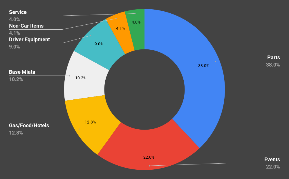 As you can see, the most expensive category at 38% is go-fast parts and maintenance items. There's a lot of fat to trim here, but top line is that if you buy an old car and beat the shit out of it, expect to spend money maintaining it. We'll come back to this later.