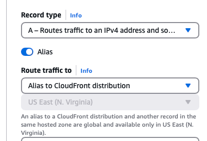 - Turn on "Alias" and then select "Alias to CloudFront distribution." The zone is locked because all CF distributions are in the global zone (N. Virginia.)